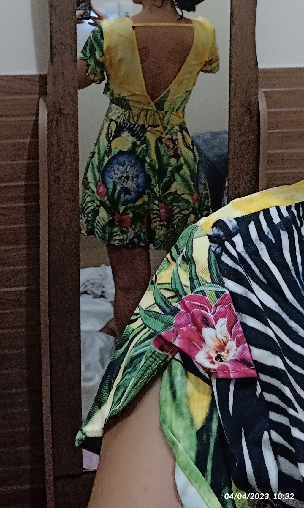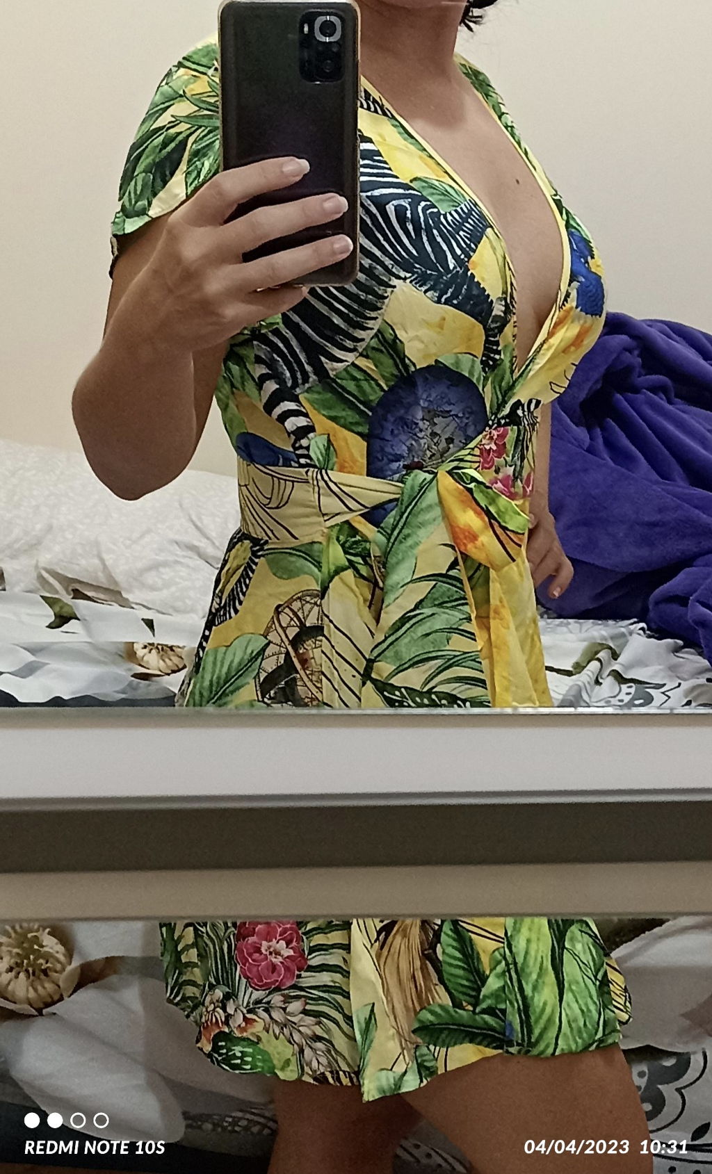 Cumprimento ótimo, tecido de qualidade, tamanho P excelente para manequim 38. Muito decotado. Vou usar um pequeno broche pra prender.